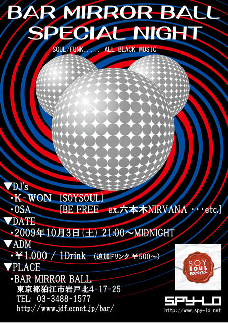MIRROR BALL“SPECIAL NIGHT”の第6回!! BLACK MUSICを中心とした選曲で朝まで呑んで踊って楽しめるっ! 今回のゲストDJはSOYSOULからK-WONを招いてのSPECIAL NIGHT!! Don't miss it!! ▼DATE ・2009年10月3日(土) 21:00〜5:00 ▼ADM: ・¥1,000 / w.1drink ※追加ドリンク ¥500〜 ▼DJ's ・K-WON [SOYSOUL] http://mixi.jp/show_friend.pl?id=19015240 ・OSA [BE FREE / SPY-LO] http://mixi.jp/show_friend.pl?id=126262 ▼PLACE: ・BAR MIRROR BALL (バーミラーボール) 東京都狛江市岩戸北4-
