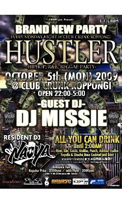 10/5(月)-HUSTLER-@六本木CRUNK OPEN 22:00 CLOSE 05:00 22:00〜02:00 4時間飲み放題!! 22:00〜02:00 \2500/飲み放題 W/F \2000/飲み放題 02:00〜05:00 \2500/1D W/F \2000/1D 【GUEST DJ】 DJ MISSIE 【RESIDENT DJ】 DJ NAOYA 【DJ】 RYUMA/SHINOBU/NORI HIDE/FIT. 【MC】 sloth/ガリレオ MASSA/WAKK 【FLOOR DANCER】 MU-TSU(POKER FACE)from兵庫 TOSHI(POKER FACE)from兵庫 YUKKE(COCO FUDGE) umi(COCO FUDGE) Naogreen(COCO FUDGE) YuU(COCO FUDGE) R-NINNY SIZZKA 【STAGE DANCER】 SATO&h