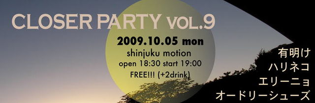 告知失礼いたします。エリーニョさんに出演していただきます! オーディエンスとより親密(CLOSER)なイベントを目指して マンスリーで開催されるフリーライブ『CLOSER PARTY』 いつもはポストロックやインディーロックマナーなイベントですが、 今月はシンガーソングで、唄物フューチャーなラインアップ。 個性的な声やメロを聴かせてくれます。 フリーライブにはもったいないアーティストさん達です! 是非それぞれの音源を聴いてみてください。 ちょっとでも気になったら一度、新宿motionの扉を開けてくれると嬉しいです。
