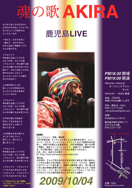 管理人さま 告知させていただきます。 よろしくお願いいたします。 AKIRA鹿児島初ライブを東串良で開催します。 10月5日(月) 鹿児島県肝属郡東串良町池之原70番地 ひっとべ館 ¥1,500(大人1drink付) 500(中高生) 小学生以下無料 18時30分open 19時 start 申し込みはプシュケまで もしくは、090ー1517ー7238 yokoarikawa@gmail.com 前日は鹿児島天文館にてライブです。 るんるん10月4日(日) 鹿児島市天文館 ワイングラスIPANEMA(
