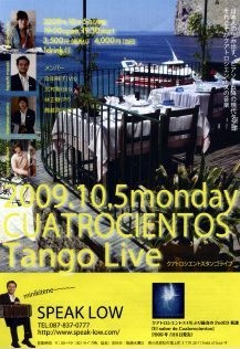 日時:2009/10/5(月) 19:00開場/19:30開演 出演:会田桃子(vn),北村聡(bn),林正樹(p),鳥越啓介(cb) 場所:高松 speak low http://www.speak-low.com/ 香川県高松市塩上町3丁目20-11 Field of Soul-1F TEL&FAX 087-837-0777 料金:前売3,000円 当日3,500円