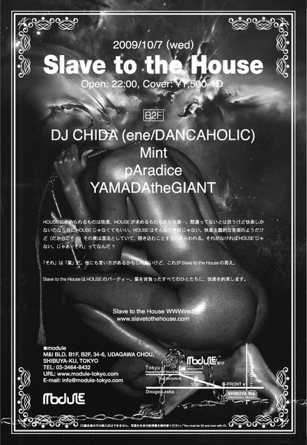 Strictly House Music Party "Slave to the House"。10月のゲストは、桑田つとむ『This is My House』やPSYCOGEM aka DJ HIIROAKI『NU BALANCE』のリリースで、今年設立されたばかりとは思えない強烈な存在感を示すeneの総帥DJ CHIDA。オープニングアクトは、まっ黒なグルーヴで虜に仕掛ける女性DJのpAradiceです。