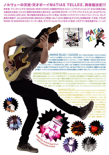 昨年春、7インチシングル「BRAND NEW KICKS」が福岡のROCK DJシーンでスマッシュヒット!さらに来福公演も大盛況&大成功!とにかく福岡の夜を沸きに沸かせた、あの天然・天才ボーイ「マティアス・テレス」が2ndアルバム「CLOUDS」を引っさげ、再び福岡の夜を荒らしにやってくる!天才的ソングライティングとパフォーマンス、そして最高の笑顔で、みんなを幸せの渦に巻き込むこと間違いなし!