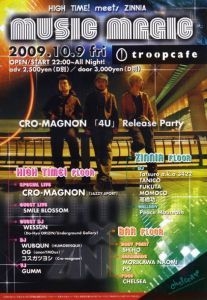 管理人さま告知失礼します。 HIGH TIME! meets ZINNIA 「MUSIC MAGIC」 Cro-magnon 「4U」 Release Party 2009 10.9 (fri) @TROOP CAFE 22:00OPEN/START ALLNIGHT! adv 2500円(D別) door3000円(D別) ◎HIGH TIME! floor Special Live Cro-magnon(jazzy sport) http://blog.goo.ne.jp/cro-magnon-nbsa/ Guest Live smile blossom http://www.myspace.com/smileblossom Guest DJ WESSUN (土俵ORIZIN) http://www.do-hyo.com/index2.html WUBQUN OG コスガツヨシ(Cro-magnon) VJ GUMM