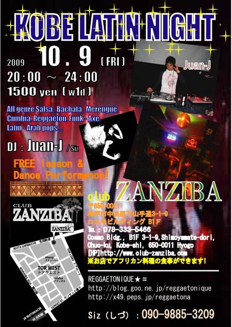 なんでもアリの神戸ラテンナイト! オールジャンルLATIN EVENTはザンジバで! 2009 10. 9 ( FRI ) 20 : 00 〜 24 : 00 1500 yen ( w1d ) レゲトニック1周年記念!! All genre Salsa , Bachata , Merengue, Cumbia, Reggaeton, Funk - Axe, Latin - Arab pops ... DJ : Juan-J / Siz Free Lesson : BOMBA!! club ZANZIBA 〒650-0011 神戸市中央区下山手通3-1-9 コスモビルディング B1F ?:078-333-5466 Cosmo Bldg., B1F 3-1-9,Shimoyamate-dori, Chuo-ku, Kobe-shi, 650-0011 Hyog