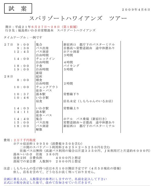 いわきに職場を移した「しもちゃん」の新しいお店を訪ねる と言う事を建前とした、スパリゾートハワイアンズへのツアーです しもちゃんの新しい仕事場は、6月10日にいわき駅前に開店予定です。 内容は今後、調整していきますが、 参加希望者がどれだけいるかを知りたいので 男性・女性の別も含めて記入いただけると助かります。 正式な内容決定後には、改めてご案内します。 6月27(土曜)〜28(日曜)の1泊2日 行き 9:30 新宿西口 都庁下のバスターミナル〜直行無料送迎バス 12:45 スパリゾートハワイアンズ