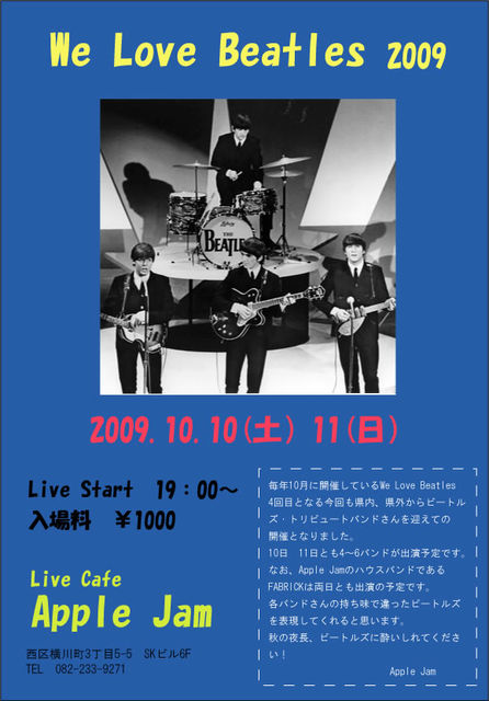 1年に1度開催される、ビートルズ祭り! 「We Love Beatles 2009」 県内外からビートルズコピーバンドが集まってライブをします。 昨年はものすごいお客様で入れなかった方もいらっしゃるほど 今年も、B-JOB(美女部)は出演します! ワタクシ、百花は、昨年、このイベントでデビューでした♪ このイベント、2日間開催されますが、 B-JOB(美女部)は第1日目トップバッターで出演です よろしければご来場下さいませ 【日時】2009年10月10日(土)〜10月11日(日) 18:30 OPEN 19:00 START