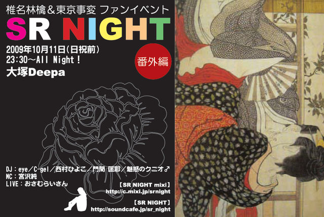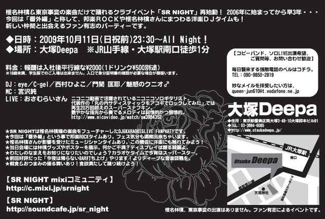 9月25日(金)に行われた「SR NIGHT」では、 皆さんに楽しんで頂けたようでとても楽しかったです! 本当に有難う御座いました。 出会った仲間との再会と、新しい仲間との出会いを実現させる為に、 「番外編」と称したSR NIGHTを開催する事になりました。 今回は邦楽ROCKタイムありや椎名林檎さんが影響を受けたミュージシャンタイム、 そしておつまみ的なお料理も振る舞います。 前回いらっしゃれなかった方も、是非遊びに来てください。 【SR NIGHT 番外編 〜気紛れを許して〜】 ◆日時:2009年10月11日(日祝前)23:30〜All Ni