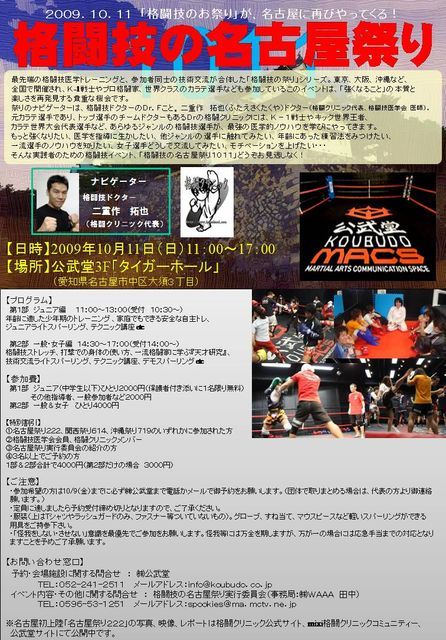 2009.10.11 「格闘技のお祭り」が、名古屋に再びやってくる! 最先端の格闘技医学トレーニングと、参加者同士の技術交流が合体した「格闘技の祭り」シリーズ。東京、大阪、沖縄など、全国で開催され、K-1戦士やプロ格闘家、世界クラスのカラテ選手なども参加しているこのイベントは、「強くなること」の本質と楽しさを再発見する貴重な機会です。 祭りのナビゲーターは、格闘技ドクターのDr.Fこと, 二重作 拓也(ふたえさくたくや)ドクター(格闘クリニック代表、格闘技医学会 医師)。元カラテ選手であり、トップ選手の