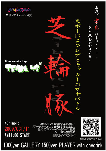 来る10月に・・・・ 遂にあの大会が開催される 48輪豚(シバリンピック) <日時> 10月11日(日曜日)11時〜 <場所> 京都48山 <内容> ・ストレートジャンプ&ジブ(ボックス)の採点方式。 ・ベストポイント制 チャレンジは2本ずつ点数の高い方を採用して順位を決めます。 <ジャッジ> 招待ライダー 藤田 剛 (ROME モリスポ) 小浜 智久(ミズノ) 山本 大樹(TAJ ミズノ) (前回はスロープ方式でジャンプ、