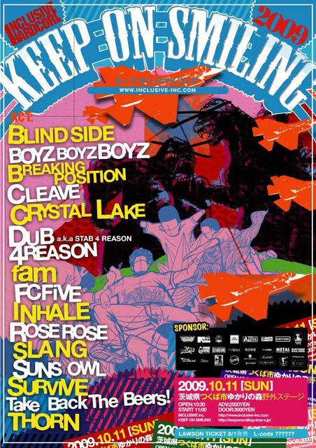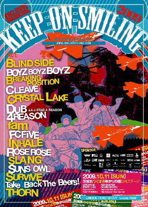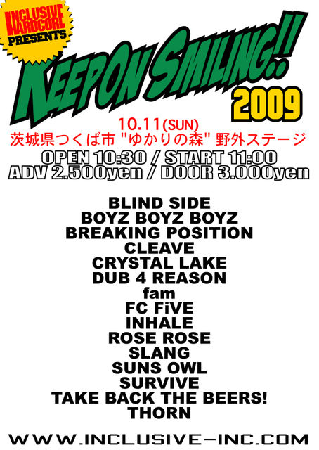 "KEEP ON SMILING 2009" 開催! 10月11日(日曜日) 茨城県つくば市 ゆかりの森 野外ステージ OPEN 10:30 / START 11:00 adv \2.500 / door \3.000 ※ローソンチケット8/1(SAT)発売! [ L-code 78466 ] -出演- *BLIND SIDE http://www.myspace.com/blindsidehccore *BOYZ BOYZ BOYZ http://www.myspace.com/boyzboyzboyzno1 *BREAKING POSITION http://www.myspace.com/breakingposition *CLEAVE http://www.myspace.com/cleavejapan *CRYSTAL LAKE http://www.myspace.com/crystallake *DUB 4 REASON a.k