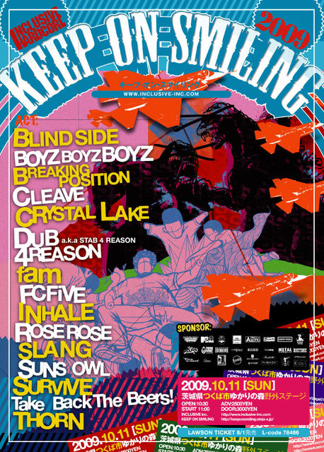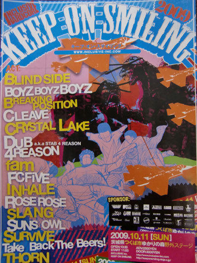 "KEEP ON SMILING 2009" 開催! 10月11日(日曜日) 茨城県つくば市 ゆかりの森 野外ステージ OPEN 10:30 / START 11:00 adv \2.500 / door \3.000 ※ローソンチケット8/1(SAT)発売! [ L-code 78466 ] -出演- *BLIND SIDE http://www.myspace.com/blindsidehccore *BOYZ BOYZ BOYZ http://www.myspace.com/boyzboyzboyzno1 *BREAKING POSITION http://www.myspace.com/breakingposition *CLEAVE http://www.myspace.com/cleavejapan *CRYSTAL LAKE http://www.myspace.com/crystallake *DUB 4