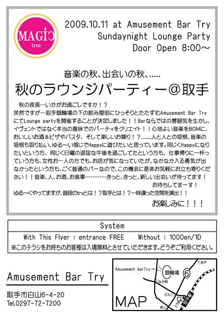 管理人様告知失礼いたします。 秋の夜長…いかがお過ごしですか!? 突然ですが… 取手競輪場の下の飲み屋街にひっそりとたたずむAmusement Bar TryにてLounge partyを開催することが決定しました!! Barならではの雰囲気を生かし、イヴェントではなく本当の意味でのパーティをクリエイト!! 心地よい音楽をBGMに、おいしいお酒&ピザやパスタ、そして楽しいお喋り!?.......人と人との垣根、音楽の垣根も取り払い、ゆる〜い感じでHappyに遊びたいと思っています。 同じくHappyになりたいという方、 同じく日曜の退屈な