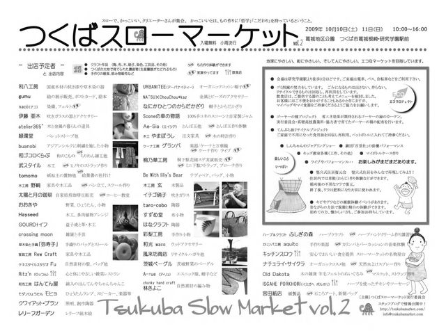 イベント告知失礼致します。(管理人者様不適切であれば削除願います) 『つくばスローマーケット vol.2』開催のお知らせ! こだわりを持ったクリエーター(手作り作家)と、個性豊かなパフォーマー(イベント)、あわせて60余の団体を皆様にご紹介するマーケットイベントです。 さまざまな取り組みを実際に見ていただくことで、ライフスタイルを見直すきっかけやネットワークが広がることを望んでいます。 ●2009年10月10日(土)・11(日) 両日とも10時〜16時(入場無料小雨決行) ●場所 つくば研究学園駅より徒歩3分 つく