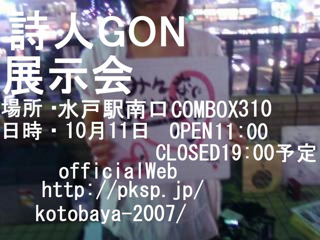 皆様始めまして、知ってる方も 今回またCOMBOX310内で イベントをやらさせて頂ける事になりました。 告知・あなたを見て直感で言葉を書きます。 あなたや家族でみんなで心に残る 一枚をお書き致します。 開催日時・10月11日・am11:00〜pm19:00予定 場所・COMBOX310・3Fシネプレックス入り口付近 後mixiかHPを見て来たよと言って頂くか COMBOX内ハロウィンイベントなので おばけや色々な仮装してご来場された皆様には特典がありますので ぜひ気軽にお越しください。 HP http://pksp.jp/kotobaya-2007/ COMBOX310HP http://www.com