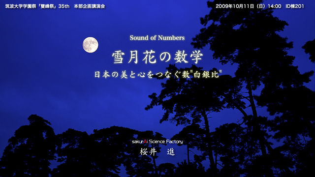 筑波大学学園祭「雙峰祭」http://www.sohosai.com/modx/index.php 講演『雪月花の数学 〜日本の美と心を繋ぐ数"白銀比"〜』 日時 2009年10月11日(日)14:00〜16:00 場所 筑波大学 http://www.tsukuba.ac.jp/access/tsukuba_access.html 1D棟201教室 http://ssfactory.sakura.ne.jp/sblo_files/ssfactory/image/1d201.jpg 主催 筑波大学学園祭実行委員会 プレスリリース http://japan.internet.com/release/40285.html http://press.onbiz.yah