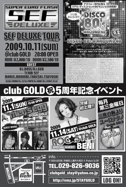 【SEF DELUXE tour】 〜EURO、TECHNO〜 10/11(SUN)21:00 OPEN -GUEST- ・DJ.BOSS/DJ.GUN ・TEAM SEF (MARIE,MANAMI,TAKESHI,TSUYOSHI) ※追悼企画 飛び入り歓迎!なりきりマイケルジャクソン コンテスト開催! 優勝賞金一萬円! DJ.YAMA/DJ.32/DJ.PAPA DJ.KABE/DJ.JEWEL/DJ.K supported by 横田商会/avex trax DAY \2500/1D ADM \2000/1D -club GOLD- http://mixi.jp/view_community.pl?id=2239903