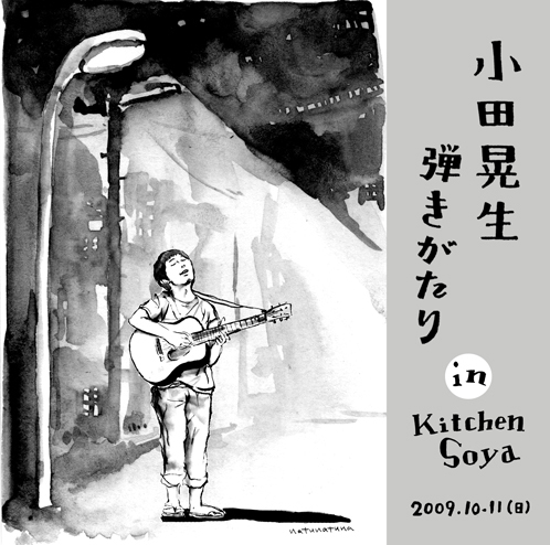 09.10.11 Sun 『小田晃生弾き語り』 《場所》茨城・つくば Kitchen Soya 《時間》Open 18:00/Start 19:00 《料金》前売 ¥2,000/当日 ¥2,500 《出演》小田晃生/Nao3(DJ) 《ご予約&お問い合わせ》 Kitchen Soya Tel 029-847-7470 http://kitchen-soya.com