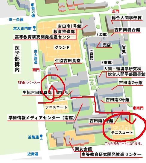 というわけで、第1回シュパースの強化練習会ということで開催させていただきます これから何度も開いていけるようにしていきますね 個人練習もあり、日頃出来ない練習もあり、試合もありでやっていければいいなと思ってます 日時:10月12日(祝日) 場所:京都大学吉田キャンパステニス東コート 時間:9時〜 (午前)練習+午前中のみの方のために試合 (午後)1、2個練習+試合 という風に考えてますその時の流れによって変更するかもしれませんが… 行き方: (車)駐車場ありなので、写真の場所に
