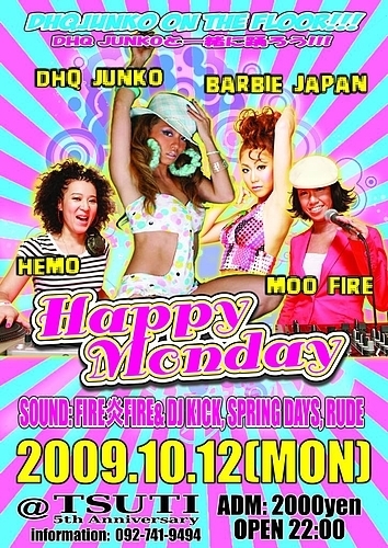 告知失礼します! 緊急告知!! 10/12 (mon) 『Happy Monday』 @Tsuti information:092-741-9494 ADM: 2000yen Open: 22:00 - SPECIAL GUEST - DHQ JUNKO HEMO&MOOFIRE BARBIE JAPAN - SOUND - FIRE炎FIRE DJ KICK SPRING DAYS RUDE(Mighty Thugz) DANCEHALLのクラブシーンで絶大な人気を誇り、 常にシーンをリ-ドしているHEMO&MOOFIREが出演決定!更に日本人初のチャットニーソカアーティストと今話題になっているBARBIE JAPANが初来福!DHQ JUNKOはフロアーダンサーとして登場、JAMAICA仕込みの熱