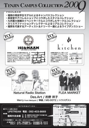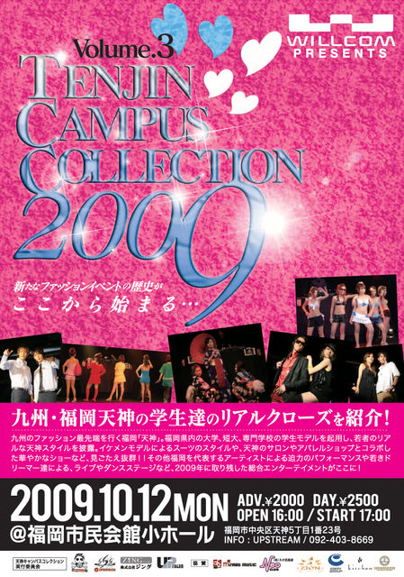 天神キャンパスコレクション2009 2009.10.12(月曜) @福岡市民会館小ホール 16:00〜21:30 福岡のリアルクローズを県内大学・短大・専門学校の学生をモデルとして起用し紹介! ミスキャンパスの出演や天神の人気サロンのショー、歌・ダンスありの天神キャンパスコレクション♪ 【LIVE】 Natural Radio Station FLEA MARKET Des.Art CHAIN REACTION 的野 祥子 【DANCE】 Merry 華雄 MG-DOTZ ハウスダスト ■前売りチケット(2000円・座席あり)のご予約・問い合わせは UPSTREAM 092-403-8669 (13:00〜21:00) 又