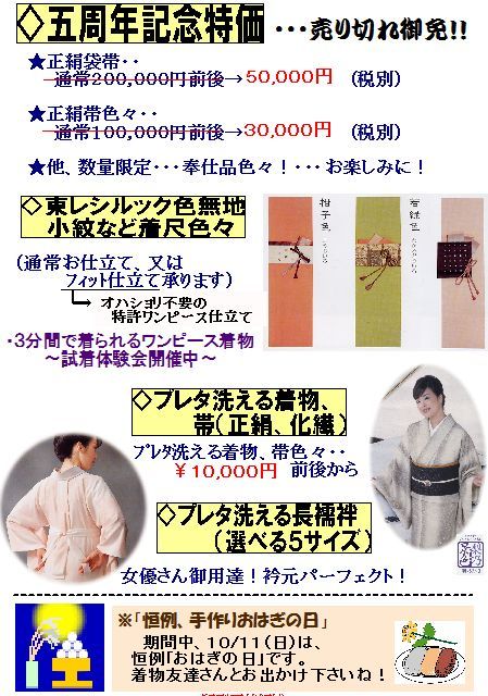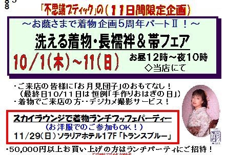 着物に恋した皆さん〜〜ん 朝夕吹く風、虫の音、冴え冴えと美しいお月さま 待ちわびた秋がやってきました〜〜。 着物ファッションが更に楽しくなる季節ですね 着物友達さんの笑顔に支えられ不思議ブティックは 洗える着物取組5周年を迎え、感謝を込めての第二弾企画 台風や連休の影響もあって、一日延長して12日まで「洗える着物フェア」開催中です 洗える着物、超人気の長襦袢はもちろん、「着物一枚、帯三本」と言われるように 帯が色々あると着物生活も随分バリエーションが楽しめるも
