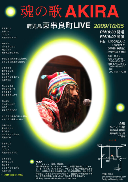 管理人さま 告知させていただきます。 よろしくお願いいたします。 AKIRAが本日より九州へ入り、ライブを行います。 AKIRA↓ http://www.akiramania.com/ 9月29日(火)九州福岡市「Kieth Flack」にてライブ【9~kyu~】 福岡県福岡市中央区舞鶴1丁目8−28 マジックスクエアビル1F/2F 電話092-762-7733 親富孝通りに所在する クラブ・ライブスペースです。 ◆地下鉄天神駅7番出口から徒歩10分◆ 地下鉄赤坂駅から徒歩10分 ◆西鉄福岡駅から徒歩10分 ◆舞鶴バス停から 徒歩3分◆長浜2丁目バス停から 徒歩3分(