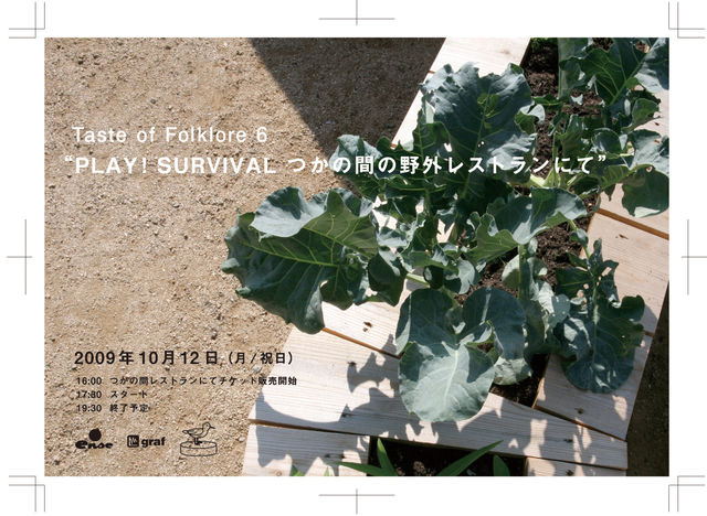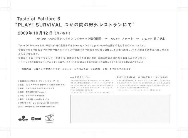 大阪grafと、大山崎enseとのダブルネームパーティー、 Taste of Folkloreを、今年も開催いたします。 今回は、grafが展開している、水都大阪の‘つかの間レストラン’を使っての、 初野外開催です。人間の基本である、旨いもん喰って、旨い酒呑んで、共に騒ぐという、 ある意味‘本能’なパーティーです。知識や情報から食べるのでなく、まず旨いもん喰って、 色々感じてくれたら幸いです。 いつものように、料理をイメージした曲を、料理が出来る前に一曲演奏し、 演奏で盛り上がった気持ちで料理を喰らう。そ