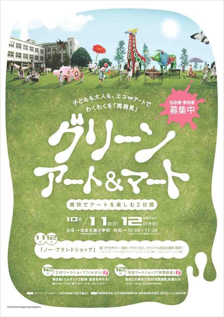 廃校の小学校のを舞台に、アートイベント開催 かにゃんクリエイトは、廃校の講堂で アートマートを出展!! 新作持っていけるかな 10月11日(日)、12日(月・祝)の2日間にわたり 服、アクセサリー、雑貨、オブジェ、イラストなど、 オリジナル作品を展示・販売します! 11日はゴスペルなどの音楽が流れる天満音楽祭と併催、 12日には工作や写真のワークショップも実施。 大人から子供まで楽しめるイベントです! 主 催:グリーン・アート&マート実行委員会(株式会社 世界文藝社) 協 力: