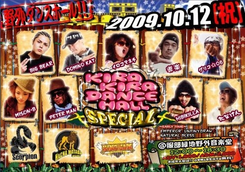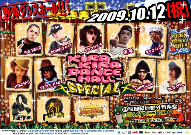 キラキラオフィシャル http://kirakiradacehall.jimdo.com/ イロコマネチブログ http://irokomanechi.blog63.fc2.com/ イベント詳細↓ <<KIRA KIRA DANCEHALL 野外SP>> ★未成年歓迎!老若男女大歓迎!秋の昼間の野外ビッグダンス! (日時) 2009年10月12日(月祝) 12:00スタート〜18:30まで (会場) 服部緑地野外音楽堂(大阪府豊中市服部緑地1-7) 06−6863−3780 (大阪市中心部から地下鉄御堂筋線一本で簡単に来れます) [TICKET] 前売り¥1000 当日¥