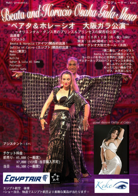 “ベアタ&ホレーシオ 大阪ガラ公演” 〜オリエンタル・ダンス界のプリンス&プリンセスの関西初公演〜 関西初!ヨーロッパを中心に世界的に活躍しているマスターカップル、Beata & Horacioをメインゲストに迎えてのガラショーです!第二幕は、2人の独占ショーとなっており、彼らのパフォーマンスを存分に楽しんでいただける、めったにない機会です!! ぜひ、お見逃しなく! 日程 2009年10月12日(月・祝) 時間 17:30開場 / 18:00〜20:20 料金 前売り(advance) VIP席:7000円(当日購入不可) / 一般席:5800円 当日(a