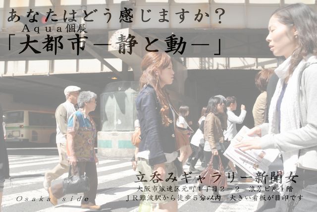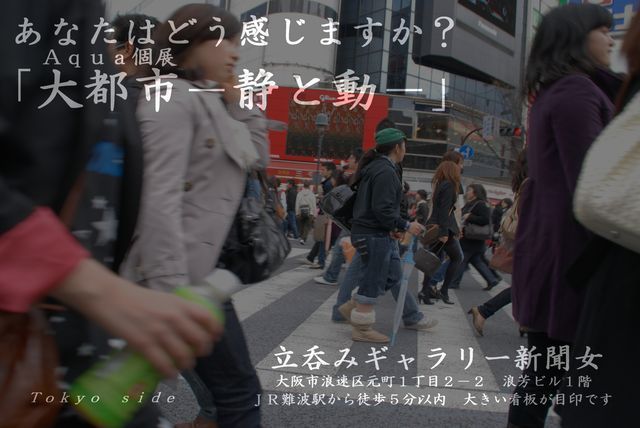 10月といえば 新聞女オープン企画 今年もたくさんするそうで いろいろ宣伝してるので この期間に個展する私も一応告知します Aqua個展「大都会−静と動−」 10月12日(月)〜25日(土) 東京と大阪の西と東の大都市を盗撮 じゃなくて街かど撮影した作品展ですが 人々のいろんな時間の動きをテーマに展示しています ちなみにフツーにまじめな写真です そうそう 3周年イベント企画にはその時の特別な写真を展示します あと 作者のきまぐれで何か違う写真を展示するかもしれません
