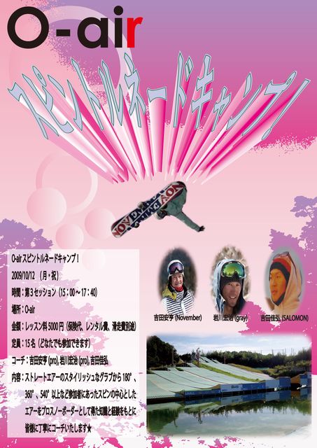 またまた、大阪ウォータージャンプO−airでキャンプをします。 この前、8月2日にやったキャンプが、ご好評につきまして第2回O−AIRでまたまた、キャンプを行うことになりました。 前回、参加できなかった方も気軽に参加してみてください。 いまや雑誌の表紙を飾るトッププロ、PSAスロープスタイル、シーズンポイントランキング1位の吉田安亨キャシャーン(November)や、JSBA全日本選手権ハーフパイプ堂々優勝の岩川宏治ポッキー(gray)、O-airでもおなじみの吉田佳弘よしよし(Salomon)が贈る、 『さあ飛ぼう!基礎しっ