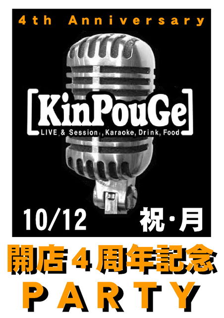 御陰様で弊店はこの10月の10日で4年目を迎える事が出来ました これも日々 ご利用下さる お客様のご愛顧の賜物だと心得ます^0^ 『 KinPouGe 4th Anniversary 企画 』 ///////////////////////////////////////////////////////// 10/12 祝・月 【祝 KinPouGe 開店4周年記念 Party 】 ///////////////////////////////////////////////////////// Open19:30 Start20:00 Close24:00 女性¥3,000/男性¥4,000<飲み放題・満腹