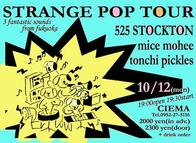こんにちは、福岡で音楽活動をしているとんちピクルスと申します。今度10/12に福岡の音楽ユニット3組でCIEMAでライブをします。どれも一風変わったポップスを奏でます。ぜひお越しください!!ご予約はCIEMA、もしくは私(利用者)あてmixiメッセージで承ります。[お名前・人数・ご連絡先]をお知らせください。 [STRANGE POP TOUR] [日時] 10/12(月・祝) 19:00open 19:30start [場所] CIEMA 佐賀市松原2-14-16 セントラルプラザ3F Tel.0952-27-5116 http://ciema.info/ [出演] 525 STOCKTON、mice mohee、とんち