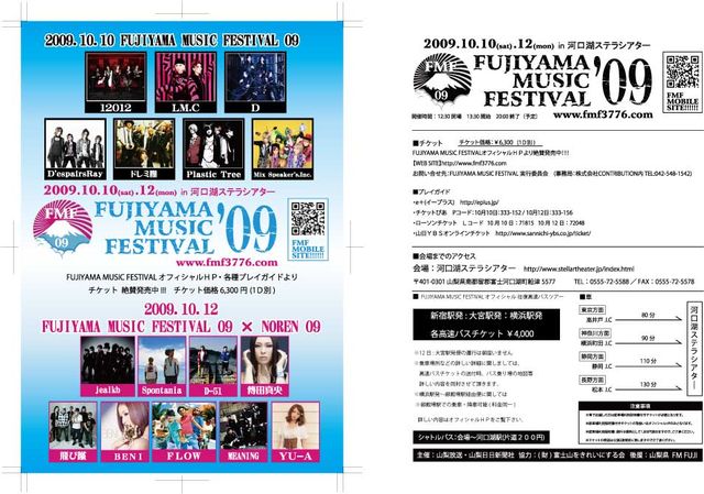 ■FUJIYAMA MUSIC FESTIVAL09 ■2009/10/10(土)・12(祝月) ■開場/開演 開場/12:30 開演/13:30 終了予定20:00 ■会場 河口湖ステラシアター 〒401-0301 山梨県南都留郡富士河口湖町船津5577 HP: http://stellartheater.jp/ ■出演者 10日:【VISUAL SHOCK】 12012 / LM.C / D / D'espairsRay / ドレミ團 / Plastic Tree / Mix Speaker's,Inc. 12日:【FUJIYAMA MUSIC FESTIVAL09×NOREN09】 jealkb / D-51 / Spontania / FLOW / BENI / MEANING / 傳田真央 / 飛