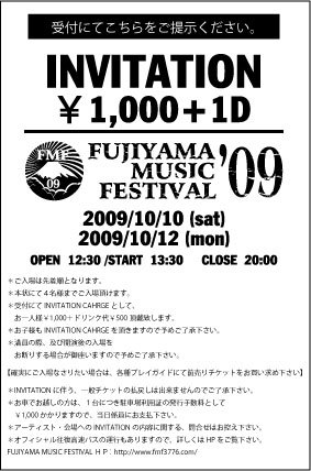 ■FUJIYAMA MUSIC FESTIVAL09 ■2009/10/10(土)・12(祝月) ■開場/開演 開場/12:30 開演/13:30 終了予定20:00 ■会場 河口湖ステラシアター 〒401-0301 山梨県南都留郡富士河口湖町船津5577 HP:www.stellartheater.jp ■出演者 10日:近日公表 12日:FUJIYAMA MUSIC FESTIVAL09×NOREN09 ・jealkb ・D-51 ・Spontania ・FLOW ・BENI ・MEANING(ELLEGARDEN/高田雄一) ・傳田真央 ・飛び蹴 (50音順) ■入場料 一般 指定席/アリーナ 前売り