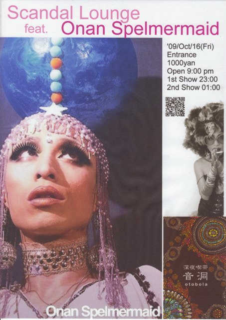 10/16(Fri)Onan Spelmermaid Show @ 音洞 日本ドラァグ・クイーン界のパイオニア! オナン・スペルマーメイド嬢、音洞にて4回目の公演です。 ファンタジック、ドリーミーかつアヴァンギャルドなステージは必見☆ Oct. 16 (Friday) Open 21:00 Entrance 1000yen Guest DJs: S.O.L & fc∞py(yes,fc∞py!) オナンHP http://onan.at.infoseek.co.jp/ 深夜喫茶 音洞ブログ http://otobola.ti-da.net/ myspace(Scandal@Otobola) http://www.myspace.com/scandal_otobola みなさまのおこしをお待ち