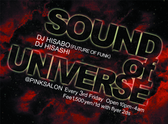 管理人様、告知失礼致します。 SOUND of UNIVERSE 2009.10.16. Friday @ PinkSalon 沖縄県那覇市山下町1-17(卓一興産第二ビル地下) 090-1940-0176 http://pinksalon-okinawa.com/ http://pinksalon-okinawa.com/i/ DJ HISABO (FUTURE OF FUNK) HISASHI Open 22:00 Fee 1,500yen / 1Drink with flyer 2Drinks Funk, Soul, House, Techno, etc...
