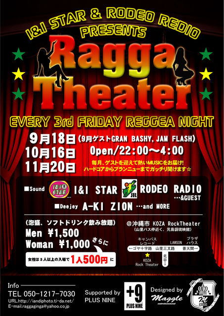 ★I&I STAR&RODEO REDIO PRESENTS EVERY 3rd FRIDAY REGGEA NIGHT★ 「Ragga Theater」Vol.10 9月16日 (Fri) Open/22:00〜4:00 Men/1500円、Woman/1000円 (泡盛、ソフトドリンク飲み放題) ●●●●★なんと!女性は三人以上の入場すると1人500円になります!!●●● @沖縄市KOZA RockTheater(山里バス停近く、元島袋琉映館) 詳しくはこちらへ↓ http://maps.google.co.jp/maps/ms?hl=ja&gl=jp&ie=UTF8&oe=UTF8&msa=0&msid=113263158201608682062.00044f88940a76f6415f1 ○HOST SOU