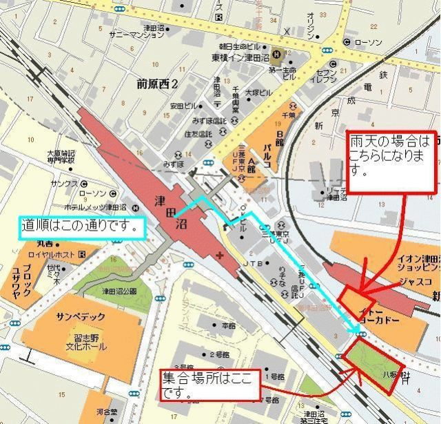 寒い季節が来る前にひと走り。 [日時] 10月17日(土)PM11:45集合 [集合場所] ★汽車公園(イトーヨーカ堂前)★JR津田沼徒歩5分、新津田沼徒歩1分 JR津田沼駅の改札前に役員を配置します。掲載した地図も見ておいてください。 [持ち物] ・参加費200円。 ・携帯電話もしくは時間の確認できるもの。 走るので、飲み物・タオルなど必要と思われるものを準備しておいてください。女性はヒールはやめたほうがいいです。 あまり大荷物は持ってこないでください。管理ができません。 当日の気温等にあわせた服装