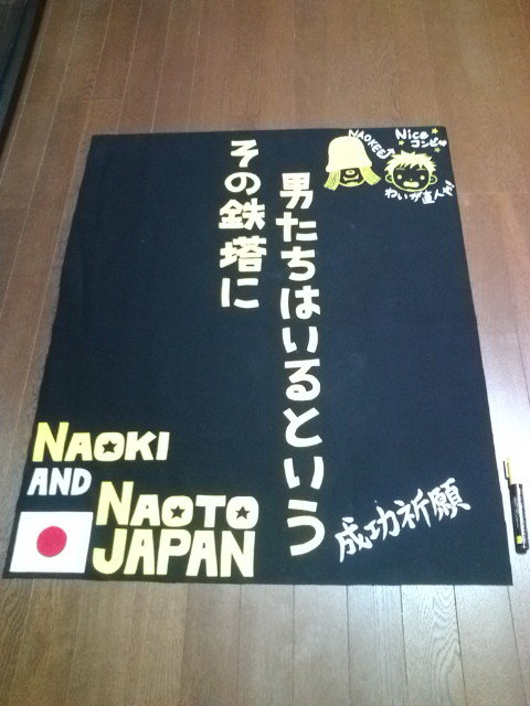 NAOTO&NAOKI★舞台 "その鉄塔に男たちはいるという" 千秋楽まで、無事成功を祈願して...ハート 幅1m×90cmの垂れ幕を作りました★ NAOTOとNAOKIに、応援のメッセージを届けませんか??うれしい顔☆ ぜひぜひぴかぴか(新しい)ご協力お願いしますexclamation ×2 約50人くらい集める予定です★ ※9月4日現在、もう3分の1ほどは埋まりました☆ 私の代筆になりますので申し訳ありませんが、心を込めて代筆させて頂くので、NAOTO、NAOKIへのメッセージを私宛に送って頂くか、こちらのトピックに書き込みお願いします★ ちなみに…