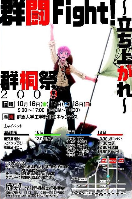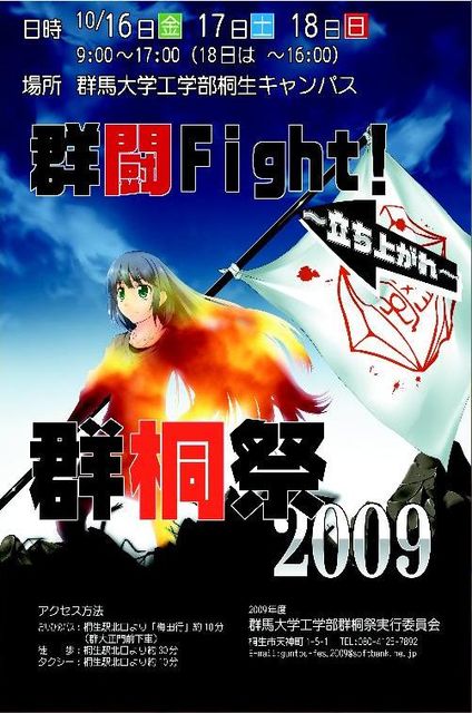 こんにちは 工学部 群桐祭実行委員です 今月10月16,17,18日の三日間、桐生キャンパスにて工学部 群桐祭2009 が開かれます。 テクノドリームツアーではいろいろな研究室で科学に触れたり、 ステージでは音楽研究会によるライブやB-styleのダンス、今年は荒牧からスペシャルゲストで 落語研究会、 大抽選会ではPS3などの豪華景品が、また最終日の日曜には恒例、女装コンテストが開かれるので ぜひ足をお運びください。 http://guntohsai0w0.web.fc2.com/flame.html