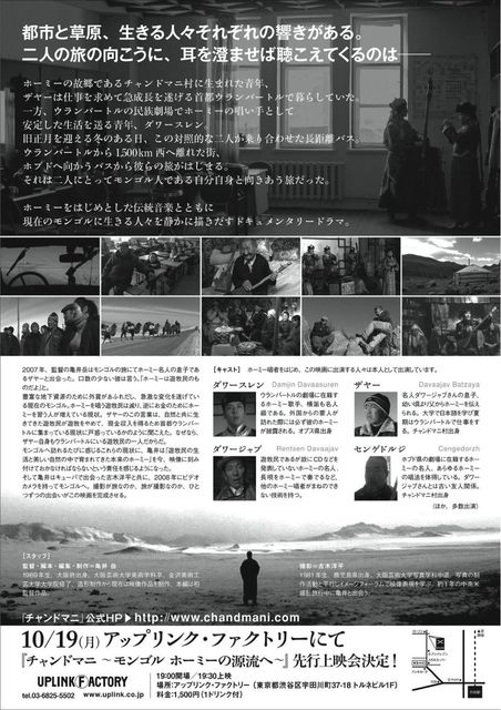 本作は、モンゴルのホーミーや伝統音楽、遊牧民の生活を映し出した映画です。主人公の若きホーミー唱者二人が、モンゴルでのホーミーの故郷とされるチャンドマニ村を目指すロードムービーとなっています。 本作の先行上映会(初公開)を、10月19日(月)渋谷アップリンク・ファクトリーで開催いたします。 是非一度ご高覧頂けますと幸いです。 興味のある方は是非とも冬のモンゴル映像をお楽しみください。 ■公式サイト http://www.chandmani.com/ ☆予告編はコチラから 『チャンドマニ 〜モンゴル ホーミーの源流へ〜』先行上映会