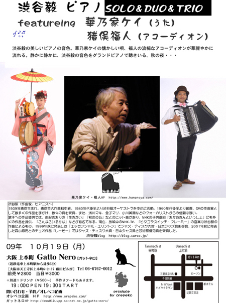 渋谷毅 ピアノSOLO&DUO&TRIO featureing 華乃家ケイ(うた)猪俣福人(アコーディオン) 渋谷毅の美しいピアノの音色。華乃家ケイの昭和歌謡からシャンソンまで懐かしい唄、福人の流暢なアコーディオンが華麗やかに流れる。静かに静かに、渋谷毅の音色をグランドピアノで聴きいる、秋の夜・・・ 09年 10月19日(月) 大阪 上本町 Gatto Nero[ガットネロ] (近鉄電車上本町駅から徒歩5分) [大阪市天王寺区上本町6-2-37 藤田ビル2F] Tel 06-6767-0012 前売¥2800 当日¥3000 +別途1ドリンク(¥500〜) 1