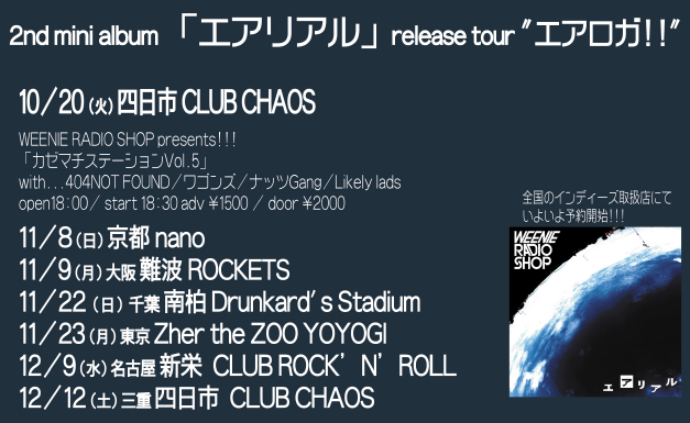 カゼマチステーション vol.5 404 not Found Likely Lads ワゴンズ ナッツGang. PM6:00/PM6:30 1500円/2000円 DRINK代別途500円必要 2nd mini album 「エアリアル」release tour"エアロガ" 初日の四日市 平日とか気にしない みんな来るのだよ ◆404 not Found HP:http://www.x404notfound.jp コミュ:http://mixi.jp/view_community.pl?id=2027418 ◆Likely Lads HP:http://sound.jp/likelylads/ コミュ:http://mixi.jp/view_community.pl?id=1500252 ◆ワゴンズ HP: