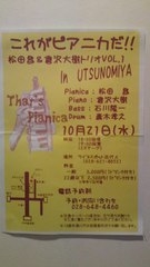 『これがピアニカだ!!松田昌&倉沢大樹トリオIN UTSUNOMIYA』 10月21日(水) 【時間】 18:00開場 19:00開演 【場所】 ライブスポット近代人(028−621−8052) http://www.ujazz.net/kindaijin00.htm 【料金】 一般3,000円(1ドリンク付き) 22歳以下2,500円(1ドリンク付き) (要身分証明書) 【電話予約制】 ご予約・お問い合わせ 028−648−4460 宇都宮で初ピアニカライブであす! 倉沢大樹トリオ! あの時の日記のあのライブですねぇ〜〜