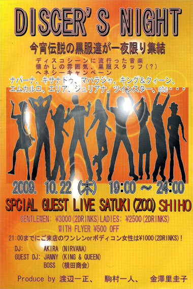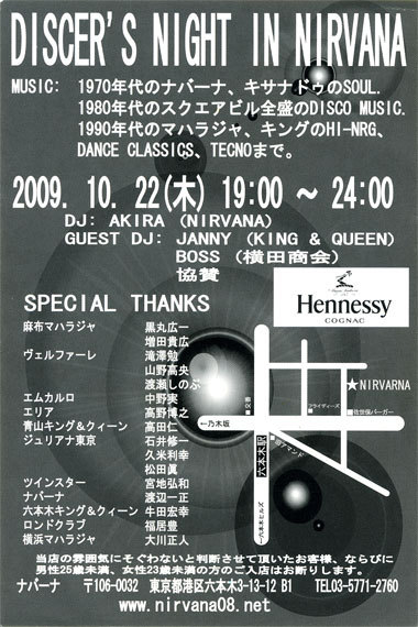 バブリーなイベントが今月あります。 あの頃が懐かしい方! 体験したい方! DISCER'S NIGHTに参加してみましょう♪ ★DISCER'S NIGHT★ 今宵伝説の黒服達が一夜限り終結! ディスコシーンに流行った音楽! 懐かしの雰囲気、黒服スタッフ(?) ナバーナ、キサナドゥ、マハラジャ、キング&クイーン、エムカルロ、エリア、ジュリアナ、ツインスター、etc・・・ 店内では、ヘネシーキャンペーン実施! ◆日時:2009/10/22(木)19:00〜24:00 ◆会場:ナバーナ ・東京都港区六本木3-13-12 B1 ・TEL:03-5771-2760