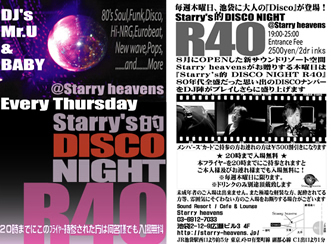新サウンドリゾート空間“Starry heavens”がお贈りする毎週木曜日は『DISCO』。ジャンルはSoul, Funk, New Wave, Pops, Hi-nrg, Eurobeatまであなたの懐かしのDanceナンバーをDJ陣が盛上げます! バブル〜な雰囲気をお楽しみください!! 10月22日(木) DJs:Mr.U & DJ Baby http://www2.famille.ne.jp/~baby/ Open:19:00-25:00 Entrance Fee:2,500yen/2drinks Starry Heavens Member's Cardご持参の方及びお連れ様、500yenディスカウント。 また、20時までの入場は無料! フライヤーご持参の方及
