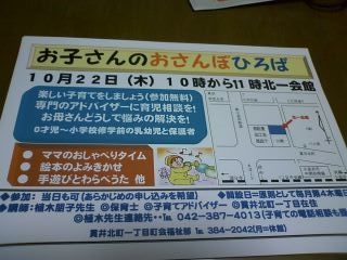 おさんぽひろば(旧えほんのよみきかせ) お子さんといっしょに のんびり まったり過ごしませんか ママたちのおしゃべりタイム 絵本のよみきかせ 手遊びとわらべうた 育児相談 子供さんの様子を見ながら のんびり進めていきます 日時 10月22日 10時から11時 場所 北一会館 (小金井市貫井北町1丁目) ? 042−384−2042(当日参加の方は直接?してください 参加費
